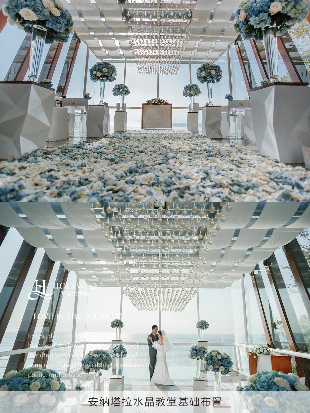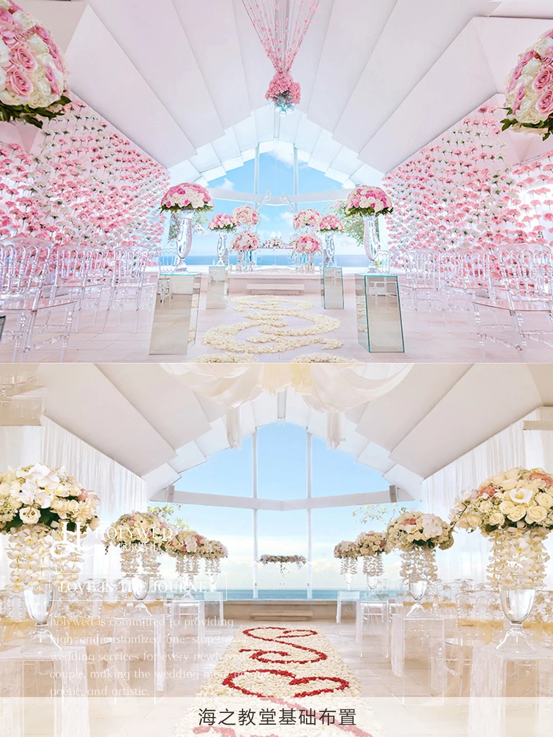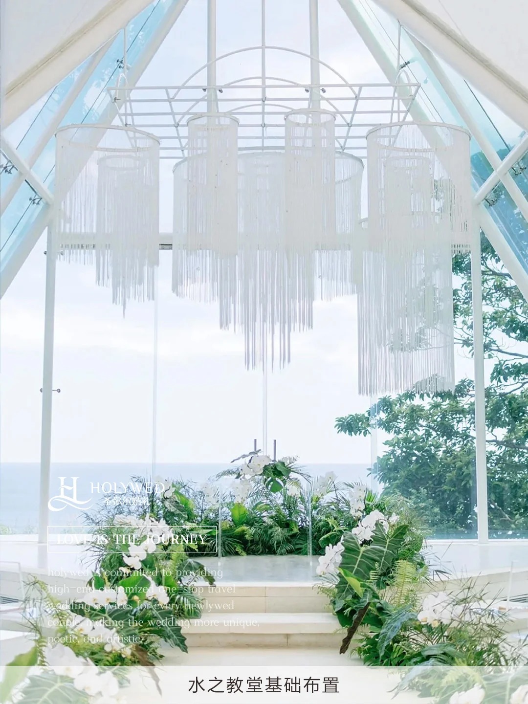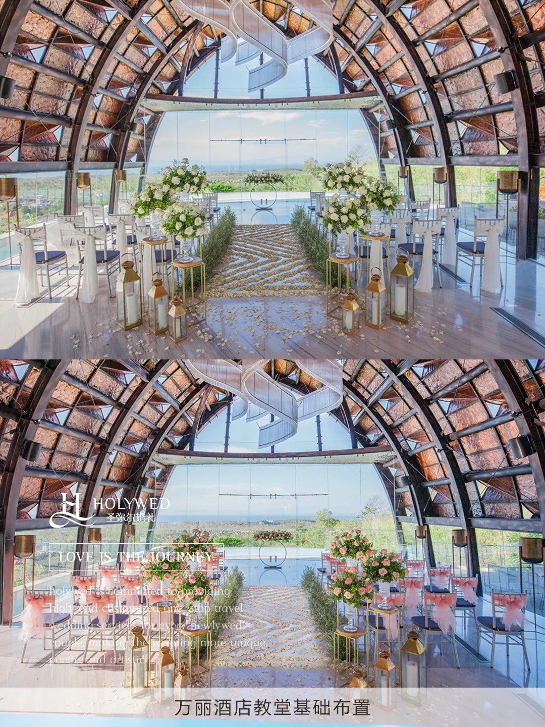 最具性价比的一处悬崖海景教堂!教堂整体的6面都采用玻璃,景观没的说,顶部有水晶灯的造型,让整体通透唯美!
