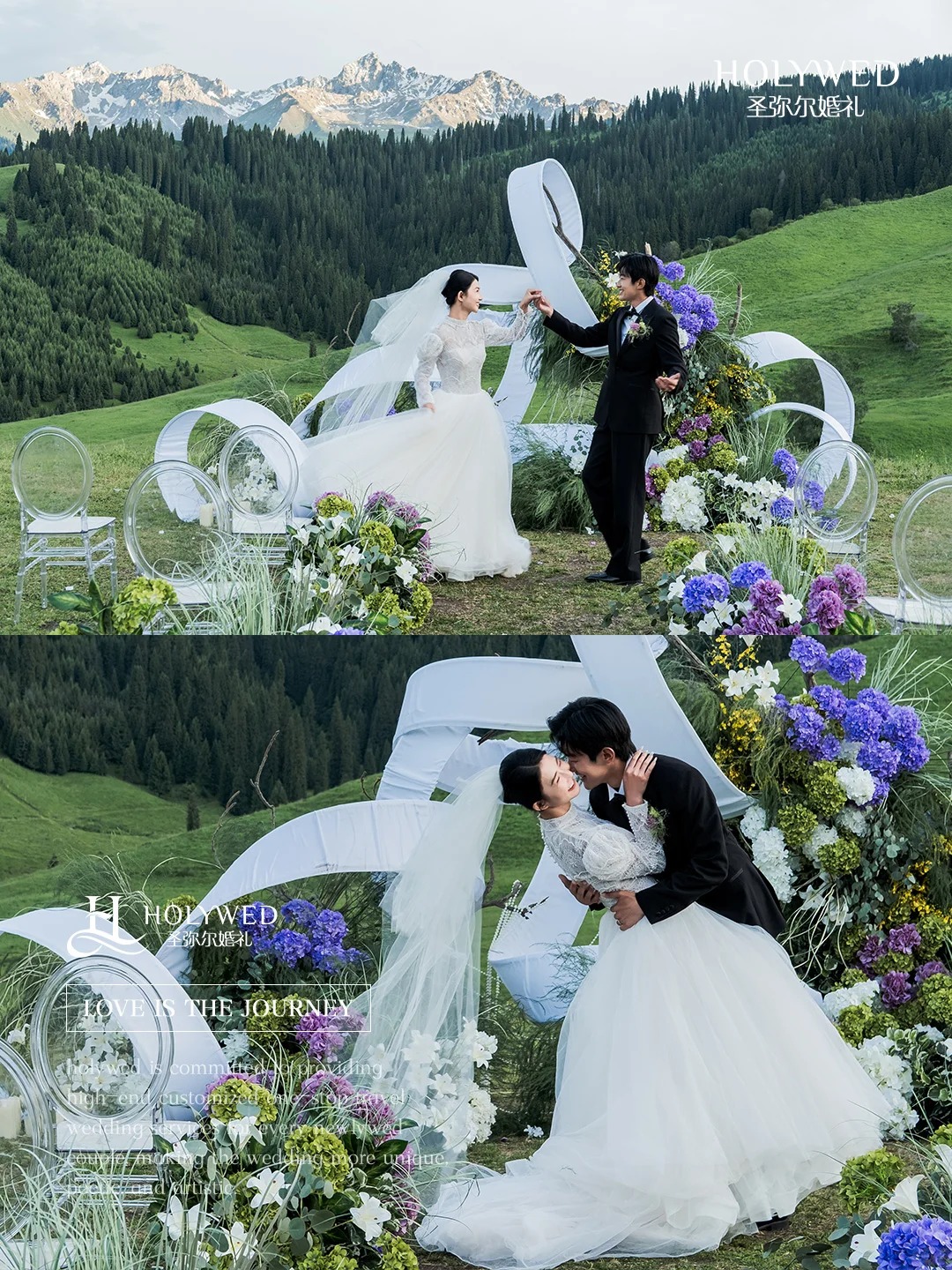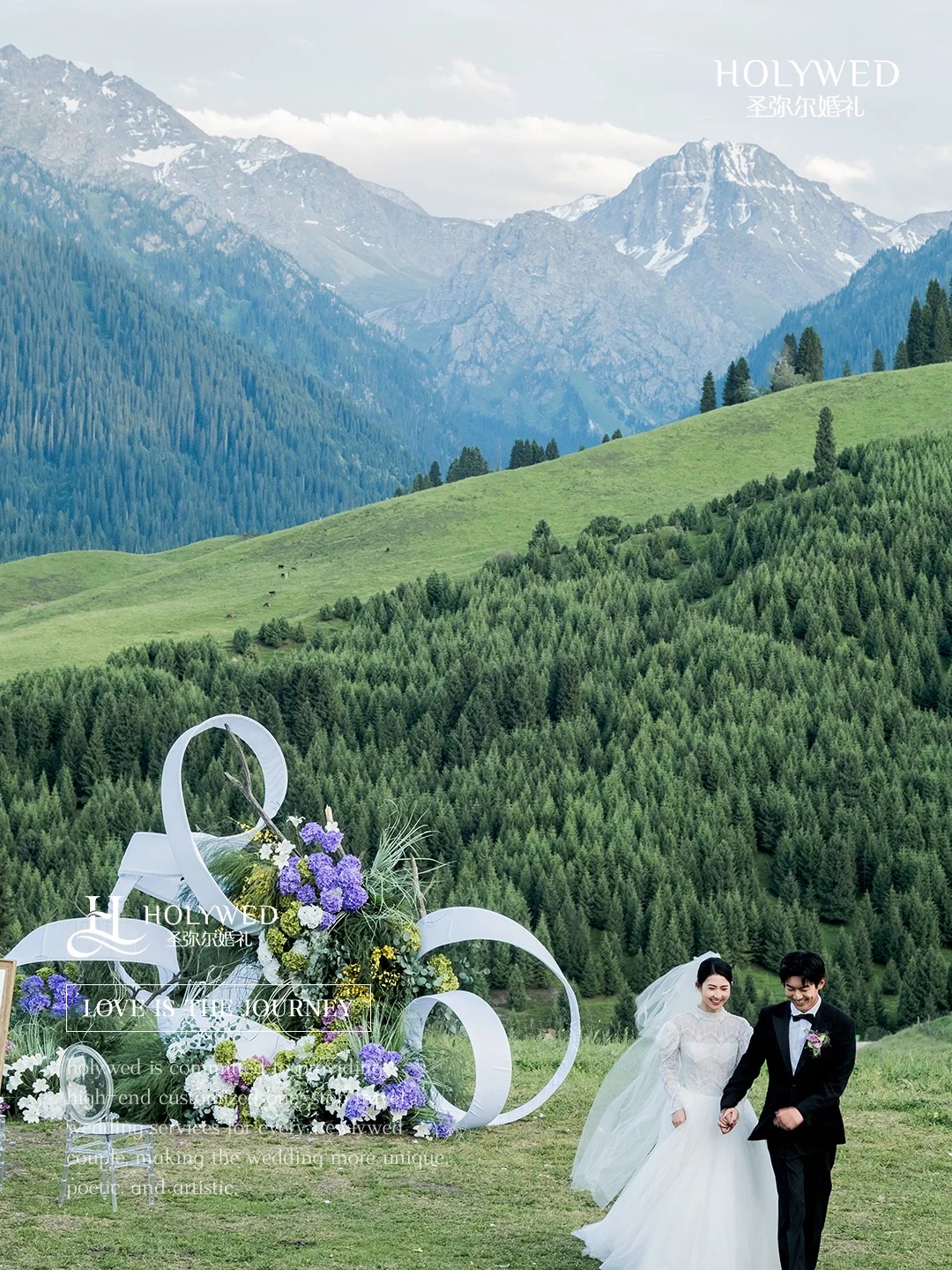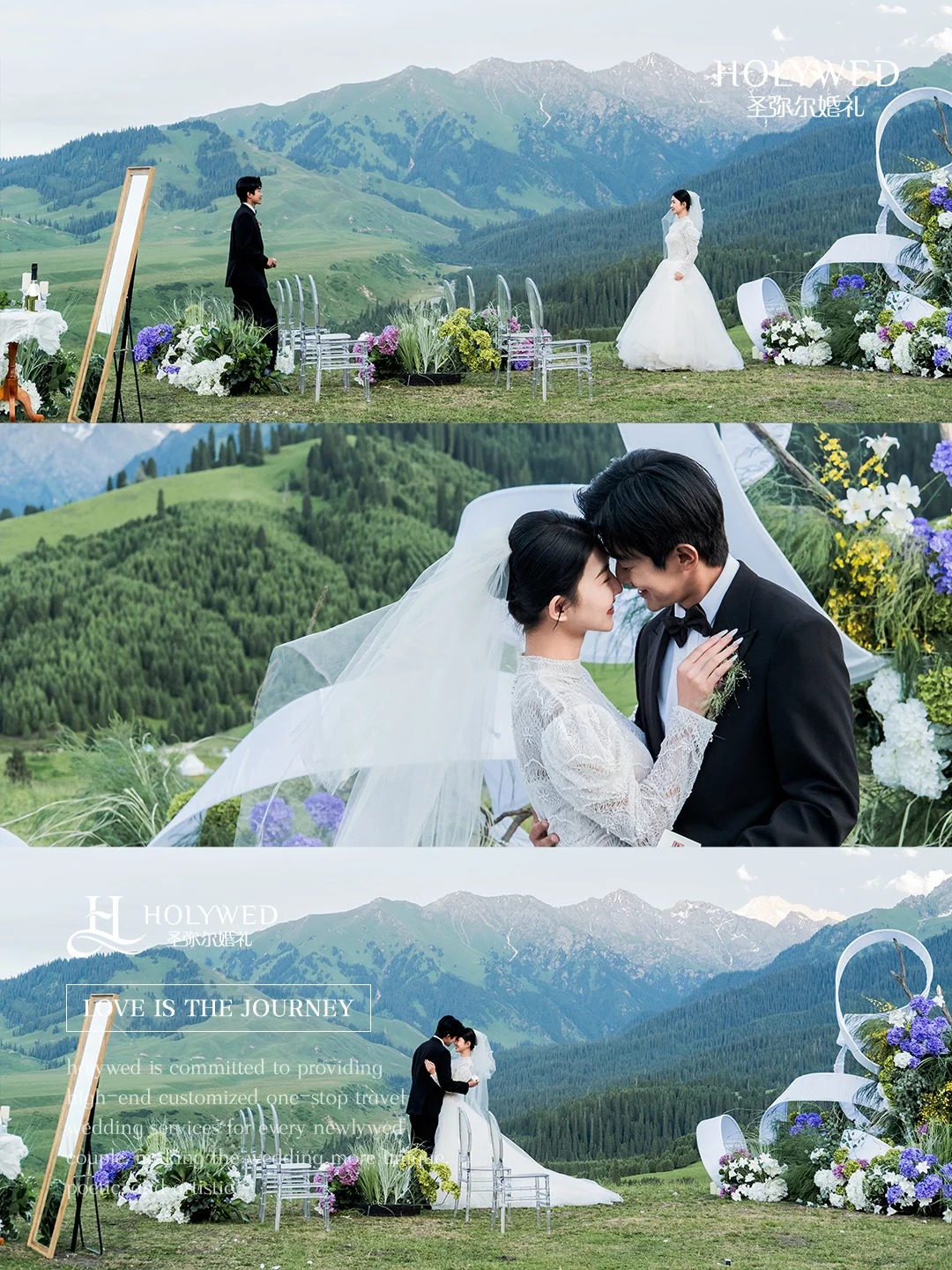 新疆旅行婚礼提供了一种自由、轻松、浪漫的选择,远离复杂的人事和备婚压力。在这里,新人可以远观巍峨的雪山,近赏湖泊、丛林、草原与鲜花,享受大自然赐予的仙境般的美景。这种目的地婚礼让新人回归自然,追求真爱,期待未来的美好生活。婚礼策划由圣弥尔全球旅行婚礼负责,地点位于新疆。