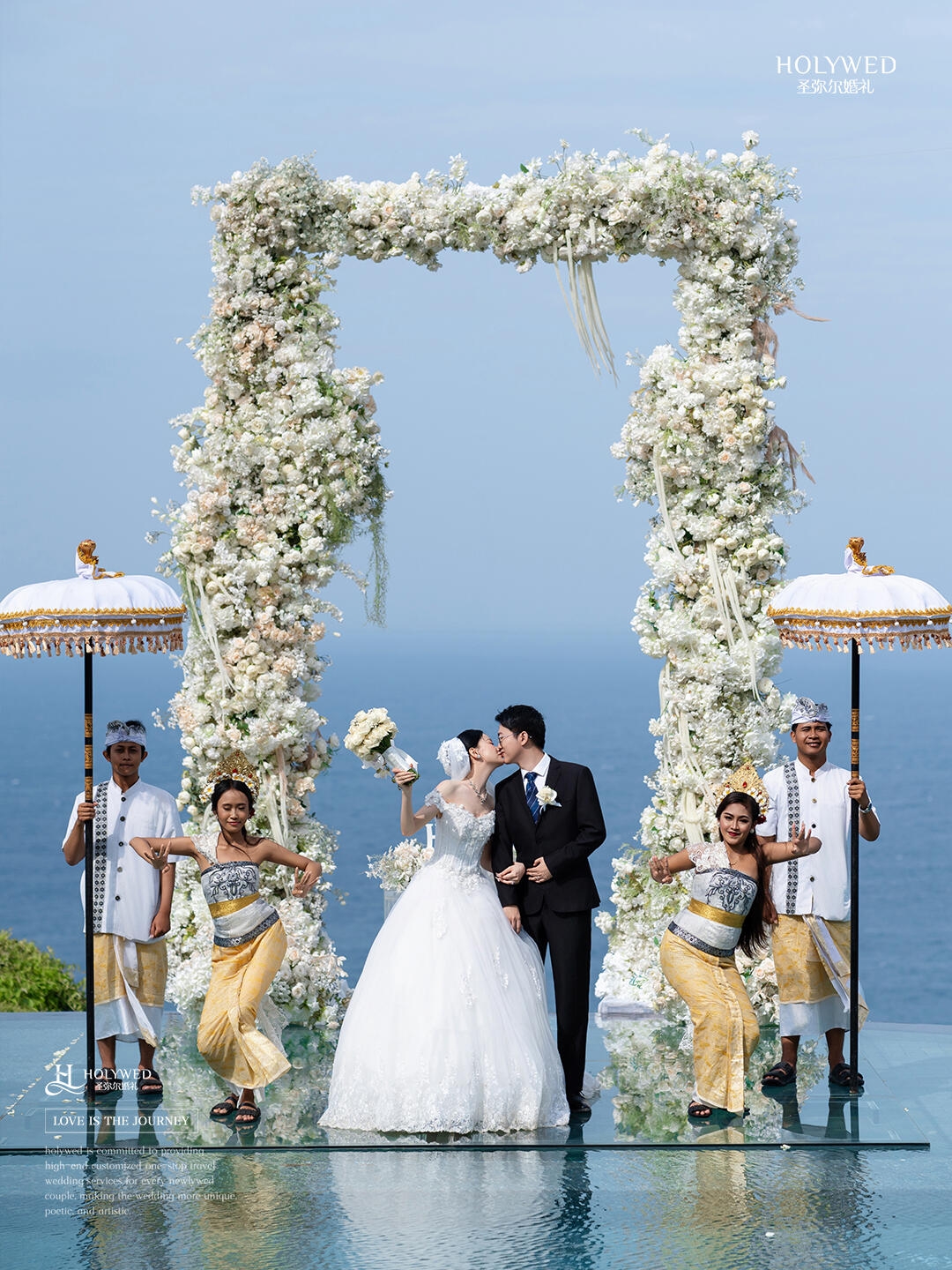 终于圆梦了!!和老公在巴厘岛复刻了秦牛正威的绝美海之水台婚礼~蓝到透明的海水配上纯白鲜花拱门,真的像走进童话一样!!💙